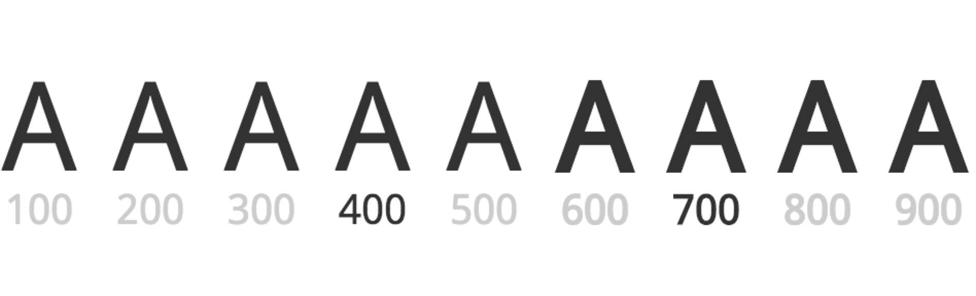 也就是100、200、300、500會表現(xiàn)為跟400同一種字重,600、800、900會表現(xiàn)為跟700同一種字重。