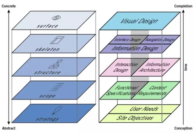 想了解 UI/UX,就一定要了解這張圖,這是 Jesse James Garrett 在2000年發(fā)表的用戶經(jīng)驗(yàn)元素一書中所提出:使用者的經(jīng)驗(yàn)可分成抽象到具體,也就是由策略、范圍、結(jié)構(gòu)、骨架、表層所構(gòu)成。