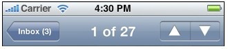 在iPhone 平臺上,如果應(yīng)用程序有信息層級關(guān)系(比如郵箱> 收件箱> 郵件),利用title 進行導(dǎo)航, 導(dǎo)航欄左側(cè)始終是返回按鈕,右側(cè)如果有必要,可以放針對內(nèi)容的操作控件,中間有標(biāo)題。