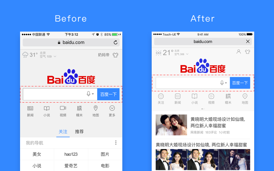 搜索導(dǎo)向-搜索入口的更好展現(xiàn)。搜索框作為發(fā)起搜索最直接的途徑,對它一點點的改變都是非常慎重的,在用戶對信息量需求激增的前提下,調(diào)整搜索區(qū)域與信息區(qū)域的占比變得尤為重要。運用黃金比例,將搜索框定位在一個最優(yōu)的比例上,同時保證信息展現(xiàn)的最大化。搜索框區(qū)域提升,內(nèi)容區(qū)域展現(xiàn)更多,滿足資訊需求。