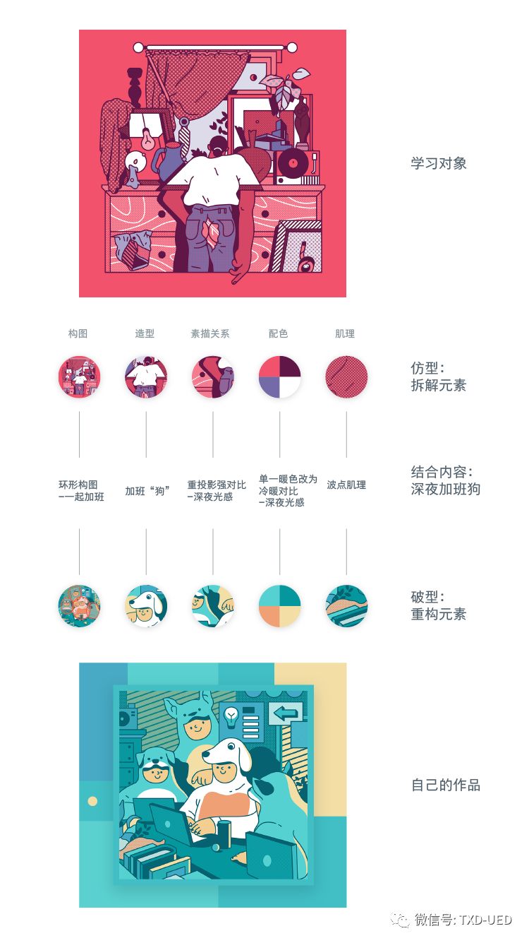 仿型,可說(shuō)是一個(gè)模仿、練習(xí)的過(guò)程。選擇喜歡的插畫(huà)作為學(xué)習(xí)對(duì)象,拆解畫(huà)面構(gòu)成元素,總結(jié)代表性特征,了解其思考方式,是一種理解原作者繪畫(huà)思路和想法的過(guò)程。