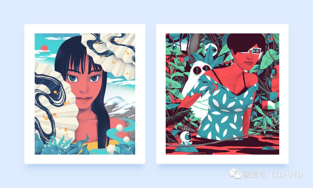 同樣的元素,在不同的設(shè)計(jì)師手上畫(huà)出的感覺(jué)一定是不同的,一個(gè)插畫(huà)師最明顯的風(fēng)格特征也往往體現(xiàn)在造型的獨(dú)特性上。造型的類(lèi)別是無(wú)法枚舉的,寫(xiě)實(shí)或抽象、松弛或硬朗、精細(xì)或概括...對(duì)造型感的提升需要我們多看優(yōu)秀的作品輔以大量的練習(xí)。