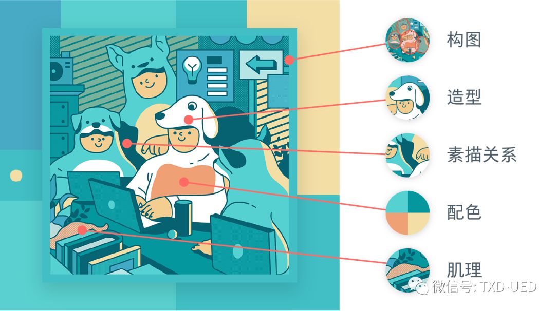我們從形式上來(lái)說(shuō)可以將一張插畫(huà)拆解為5個(gè)構(gòu)成元素:構(gòu)圖、造型、素描關(guān)系、配色和肌理。