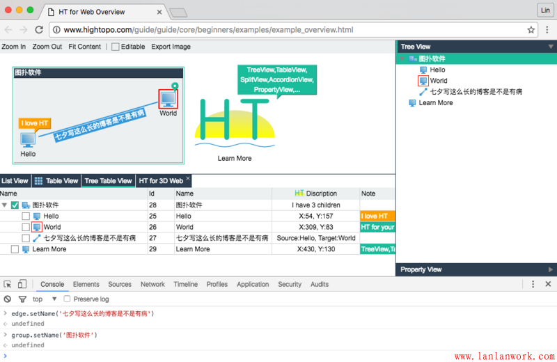 這個(gè)例子增加了設(shè)置父子關(guān)系的代碼,同時(shí)有更多的組件(拓?fù)鋱D、屬性頁(yè)、列表、樹(shù)、表格、樹(shù)表組件)綁定了同一個(gè)數(shù)據(jù)模型 DataModel,但用戶的代碼依然主要在 Data 和 DataModel 上的操作,這也是 HT 架構(gòu)設(shè)計(jì)的優(yōu)勢(shì),用戶使用更多組件并沒(méi)有增加新的學(xué)習(xí)成本,只要掌握的 DataModel 的基本操作,更多的組件也是如此。