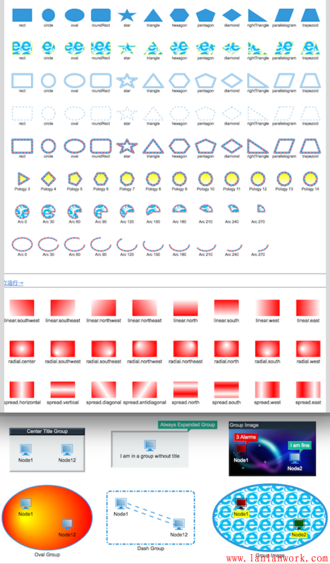 剛才的例子我們提到了一個(gè) Group 類(lèi)型,這個(gè)類(lèi)型圖元節(jié)點(diǎn)在 GraphView 上顯示成了組合效果,可雙擊展開(kāi)合并,可跟隨著孩子節(jié)點(diǎn)的位置大小變化和自適應(yīng)變動(dòng),除了 Node、Edge、Group 外,HT 還提供了 Shape、Polyline、Grid、SubGraph 等多種圖元類(lèi)型,這些圖元類(lèi)型都具是有針對(duì)性的展示效果,以滿足各種行業(yè)的基本圖元需求:http://www.hightopo.com/guide...
