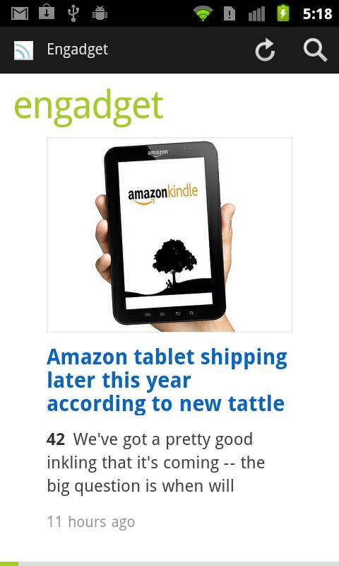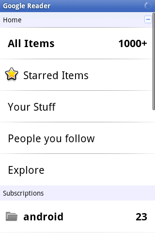 (Google Reader應用在設(shè)備頂端顯示一個小的旋轉(zhuǎn)符號,每當應用在后臺加載內(nèi)容時這個符號就會出現(xiàn),這樣你就會意識到自己或許需要等待一段時間。)