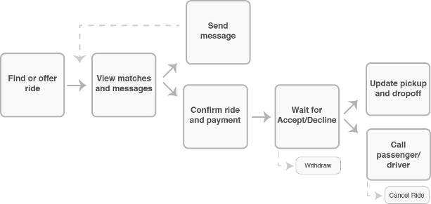 為此,我參考了其他一些協(xié)同消費(fèi) (Collaborative Consumption)類型的應(yīng)用產(chǎn)品,例如Airbnb 和Yardsale 等等。在嘗試了多種流程及界面布局方式之后,我們決定采用一種輕量級(jí)的確認(rèn)序列機(jī)制,它的操作界面類似于大家所熟悉的短消息界面。無(wú)論駕車者還是搭乘者都可以發(fā)起確認(rèn);例如,旅程結(jié)束后,一旦搭乘者完成了支付,駕車者收到款項(xiàng),此次拼車活動(dòng)就會(huì)被確認(rèn)完成。