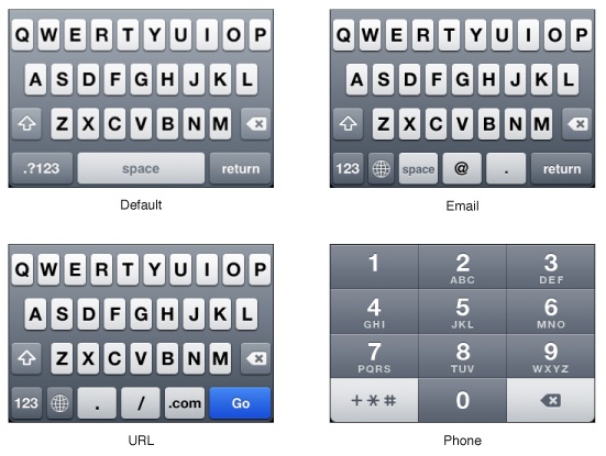 - 智能手機(jī)的系統(tǒng)平臺當(dāng)中通常都會內(nèi)置一些針對不同類型內(nèi)容的鍵盤,例如文本、數(shù)字、Email、URL等。在你的應(yīng)用中,確保針對不同的內(nèi)容類型使用對應(yīng)的鍵盤,提升用戶輸入的效率。