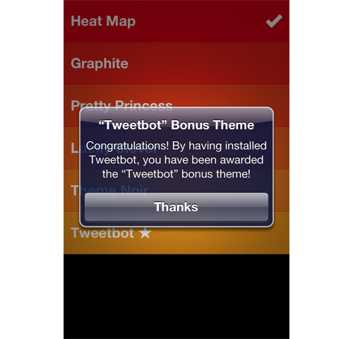 驚喜、專享 :在應(yīng)用中打開主題設(shè)置界面后,安裝了Tweetbod的用戶會收到一條消息,恭喜他們獲得了專享的額外主題。這些用戶很可能因為受到了特殊照顧而感到開心,另外,這個群體在口碑傳播方面的作用是相當(dāng)大的。