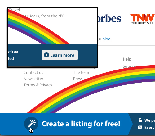 驚喜 :瀏覽到頁腳,你會發(fā)現(xiàn)鼓勵你免費創(chuàng)建活動的圖標(biāo)與文案,當(dāng)鼠標(biāo)懸停在圖標(biāo)上的時候,一道絢麗的彩虹會突然冒出來,它的動畫效果所指向的正是引導(dǎo)用戶這個操作的按鈕。