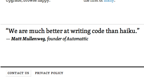 標(biāo)語 :Automattic的標(biāo)語之一是“比起俳句,我們更擅長寫代碼”。正是這種看似嚴(yán)肅認(rèn)真的幽默感,或者說看似幽默的認(rèn)真,奠定了他們的產(chǎn)品基調(diào)。