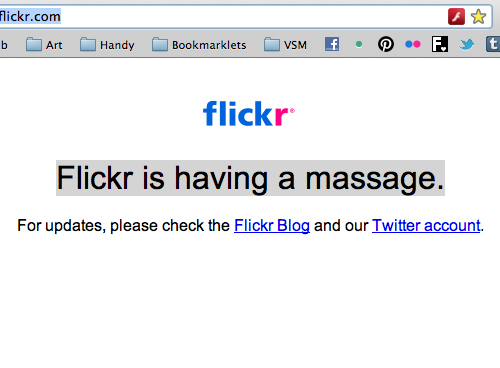 用戶在Flickr進行系統(tǒng)維護或升級期間會看到"Flickr正在做按摩"的提示,如果有興趣的話還可以到他們的官方博客或是微博當(dāng)中查看當(dāng)前的具體狀況。這樣的文案比起簡單粗暴的出錯提示來說更能讓用戶接受。