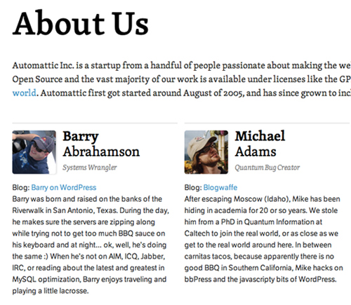 幽默 :在Automattic的“關(guān)于”頁面中充滿了和善幽默的自我介紹,感興趣的用戶在閱讀時就能感受到他們那種充滿樂趣的工作環(huán)境。