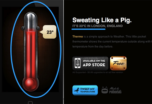 Thermo 應(yīng)用的著陸頁可以判斷用戶所處的地理位置,并在左側(cè)以高度擬真的視覺表現(xiàn)形式來告訴用戶當(dāng)?shù)氐臍鉁厍闆r。