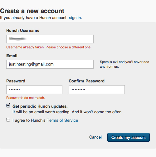 Hunch 注冊頁面當(dāng)中的文案與我們通常能夠見到的那種有所不同,他們會在輸入郵件的文本框旁邊告訴你“垃圾郵件是魔鬼,我們可不干這事”,還會在選擇郵件訂閱的地方提示你“這會是值得一讀的郵件,而且來的不會太頻繁”。在這些很普通的地方稍稍花些心思,制造一些細(xì)微的差異化,這會增強產(chǎn)品的代入感,使用戶的注意力更集中,跟隨設(shè)計的指引完成操作目標(biāo)。