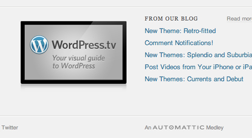 文案 :在wordpress.com首頁的頁腳當(dāng)中有一段每次加載頁面都會發(fā)生變化的簽名語,有時是“來自Automattic的產(chǎn)品”,有時變?yōu)?ldquo;來自Automattic的樂章”。這種細(xì)節(jié)體現(xiàn)了他們對于自己產(chǎn)品的熱愛。
