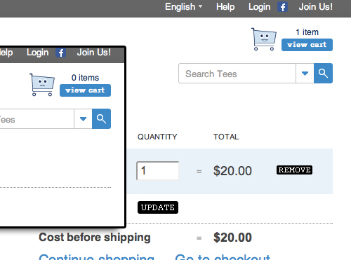 Threadless 的購物車在沒有商品放入時會呈現(xiàn)出憂傷的表情,反之則會表現(xiàn)的非常開心。這樣的小細(xì)節(jié)會讓你覺得平凡而有趣,甚至?xí)挥勺灾鞯男ζ饋?。即使用戶最終沒有產(chǎn)生購物行為,他們也會記住這個可愛的購物車。