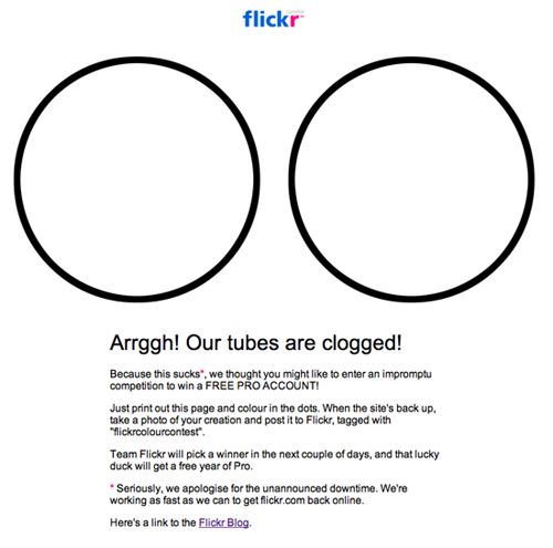 同樣來自于Flickr的案例。當(dāng)系統(tǒng)發(fā)生了一些更加嚴(yán)重的問題時,他們會告訴用戶:“額,我們的管道堵塞了!”,然后使用非??谡Z化的文案表示了歉意。除此之外,他們還為用戶設(shè)置了一個小任務(wù),也就是將當(dāng)前頁面打印出來,為兩個圓環(huán)填色,然后拍下來,等到站點恢復(fù)正常后傳到Flickr上;Flickr團隊會挑選出優(yōu)勝者,向他們贈送一年的高級帳號。