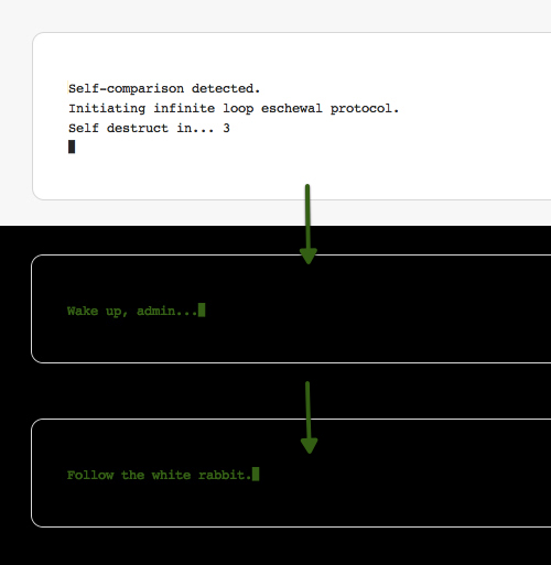 彩蛋 :在WordPress的self-comparison當(dāng)中有個彩蛋。為了防止相同版本的文章進行自我比較,Automattic創(chuàng)建了一個小機制,無論是其中的文案還是視覺風(fēng)格都模仿了黑客帝國當(dāng)中的段子。這篇文章 會教你怎樣在WordPress當(dāng)中找到這個彩蛋。