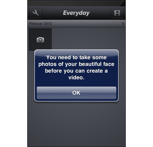 在"Everyday"應(yīng)用當(dāng)中,如果你還沒有向媒體庫中添加照片,那么系統(tǒng)就會非常友好的提示你去給自己“漂亮的臉蛋”拍些照片放到庫中——簡單的詞匯定義了提示信息甚至是產(chǎn)品的基調(diào),換句話說,就是個性。