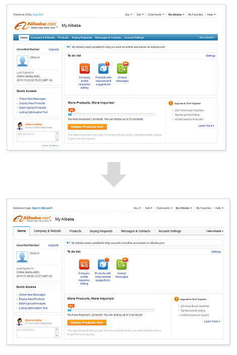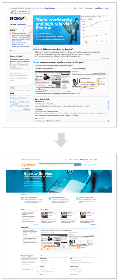 上圖我們團隊對alibaba.com提供的服務(wù)介紹頁面進行改版的項目,改版前的設(shè)計層級區(qū)分不明顯,使得用戶進入該頁面時不能快速了解服務(wù)的概況,來判斷是否繼續(xù)深入了解;而改版后通過大小的對比,呈現(xiàn)抓住用戶第一眼印象的信息,初步判斷符合自己的需求,用戶才會繼續(xù)瀏覽。