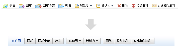 上面的是我們外貿(mào)郵界面目前的狀態(tài),所有的操作都并列擺放,隨著功能的增多,用戶識別的效率大大降低,優(yōu)化的方案是將相關(guān)的操作進行分組,正是運用關(guān)聯(lián)和并列的信息關(guān)系進行設(shè)計