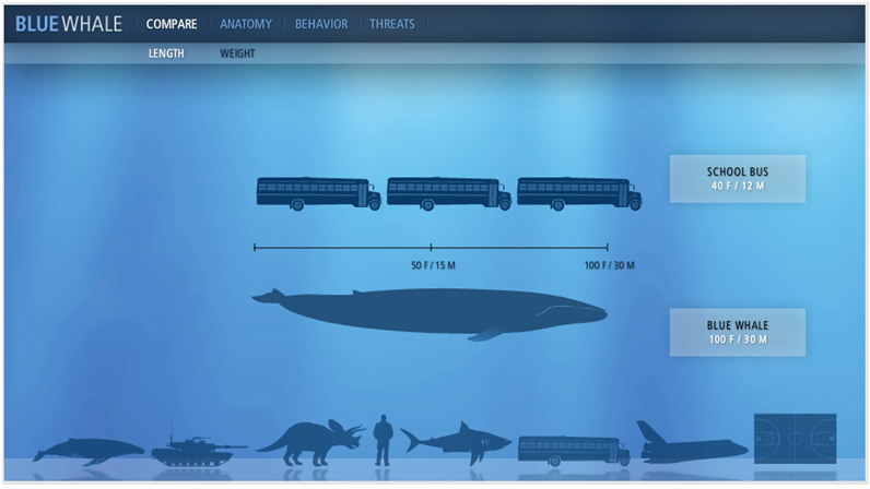 舉個例子:國家地理藍鯨網(wǎng)站 為了呼吁保護藍鯨,首先要讓人們了解藍鯨的特征及當(dāng)前的威脅,網(wǎng)站通過動態(tài)的將藍鯨與其他生物和人造物進行對比,形象直觀的傳達藍鯨的重量、大小,加上視頻展示目前藍鯨的主要生活威脅,用戶即使不閱讀文字也能大致明白網(wǎng)站想要傳達的信息