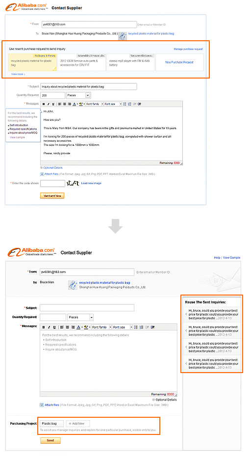 下面左圖框出部分是增加的功能,希望買家在發(fā)詢盤給供應(yīng)商時能對當(dāng)前的采購需求建組并復(fù)用上次的內(nèi)容,在內(nèi)部討論時,大家都覺得要強化該選項,讓它成為其他內(nèi)容的統(tǒng)領(lǐng),然而調(diào)研的結(jié)果卻大相徑庭,用戶無法理解這塊內(nèi)容或干脆以為是貼的廣告內(nèi)容而忽略;