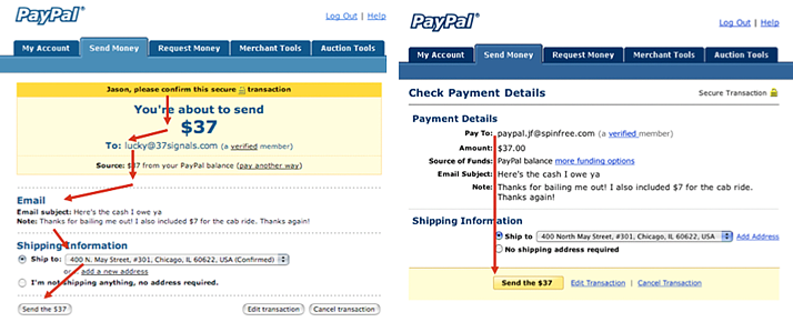 下圖是PayPal支付頁面的一次優(yōu)化過程,老版視覺雖然有層級區(qū)別,卻打亂了完成任務(wù)的視線順序,優(yōu)化后強調(diào)行動點,行動前的視覺順序在同一方向上,順序的關(guān)系很明顯,能提升用戶的任務(wù)完成率。