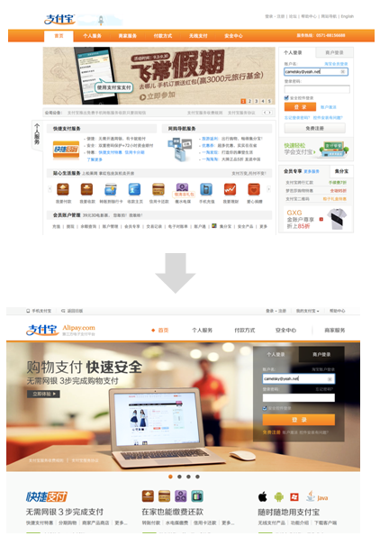 支付寶近期在測試新版首頁,我們來到支付寶首頁最常進行的操作就是登錄,而老版首頁視覺第一焦點是導(dǎo)航及活動推廣位,導(dǎo)航只要在固定的位置,用戶在需要時能找到就已經(jīng)達到目的了,它不應(yīng)該成為頁面的視覺焦點,除非用戶經(jīng)常在導(dǎo)航進行切換以了解網(wǎng)站提供的服務(wù),在這點上新版首頁弱化了導(dǎo)航及其他應(yīng)用入口,強化支付寶本身的品牌傳達及登錄行為,很符合主流用戶的行為習(xí)慣