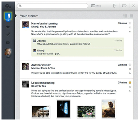 Fluent新型電子郵件界面,箭頭指向、縮進的表現(xiàn)形式很清晰的表達信息的包含關(guān)系,雖然這個創(chuàng)業(yè)團隊沒有成功,但產(chǎn)品的設(shè)計還是很值得借鑒的