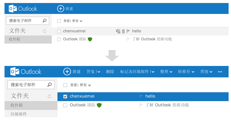Outlook郵件網(wǎng)頁界面,默認情況下對郵件的操作入口都是隱藏的,只有當(dāng)用戶選擇了郵件之后,才會出現(xiàn)對郵件的操作,同時不常用的操作也會被隱藏到下拉菜單中,如“答復(fù)”菜單下隱藏的“全部答復(fù)、轉(zhuǎn)發(fā)”,這種隱藏非核心內(nèi)容的處理方式,能讓用戶更集中于他可關(guān)注的信息和主要操作