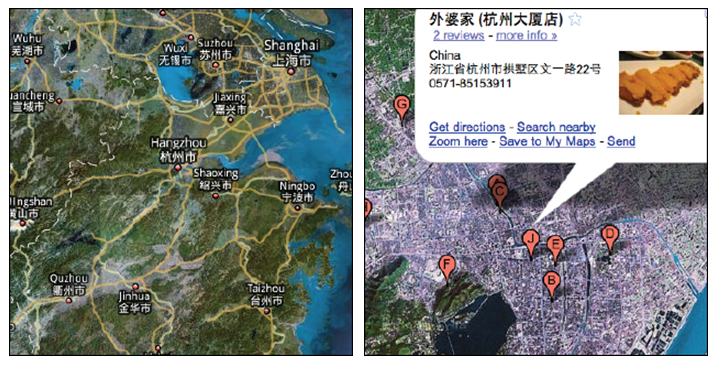左地圖是市級展示的地名,當(dāng)用戶搜索到街道級別時,才會把本街區(qū)內(nèi)的店鋪展示給用戶,在特定的情況下只展示必要的信息,有利于用戶找到自己的目標(biāo)