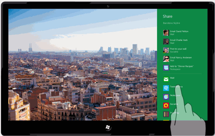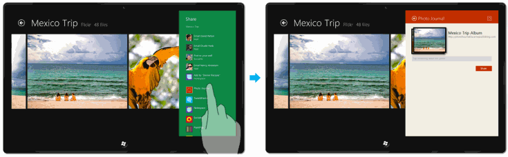 而在Metro風(fēng)格的應(yīng)用當(dāng)中,我們會使用分享契約 。這種技術(shù)方案簡化了設(shè)計(jì)與開發(fā)方面的工作,因?yàn)槲覀儾恍枰獮橛脩粲锌赡苡玫降纳鐣?wù)而將它們與每個(gè)單獨(dú)的應(yīng)用都逐一整合起來。不僅是社會化服務(wù),用戶還可以將信息保存共享至平臺上所有那些使用了分享契約的應(yīng)用,而開發(fā)者們則無需擔(dān)心外部服務(wù)的接口問題。站在用戶的角度,他們可以在charms bar這個(gè)固定的地方完成有關(guān)分享的操作。