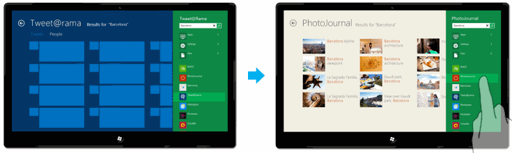 如上圖所示,用戶當(dāng)前處于Tweet@Rama 應(yīng)用的環(huán)境當(dāng)中,出于某種需求,該用戶希望搜索相片應(yīng)用當(dāng)中所有包含“Barcelona”關(guān)鍵詞的相片。輸入了關(guān)鍵詞之后,用戶在搜索托盤中選擇相片應(yīng)用,使其成為搜索結(jié)果提供者,這時(shí)相片應(yīng)用就會自動加載,并顯示相關(guān)的搜索結(jié)果。這種方式使得用戶無需手動在當(dāng)前運(yùn)行的應(yīng)用與搜索目標(biāo)應(yīng)用之間進(jìn)行切換。
