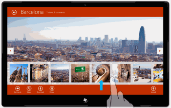 無論在iOS還是Windows中,這兩個(gè)手勢在很多時(shí)候都被用作放大或縮小內(nèi)容對象的尺寸。不過對于Metro應(yīng)用來說,它們還可以通過Semantic Zoom來實(shí)現(xiàn)內(nèi)容層級間的導(dǎo)航。用戶可以捏合某個(gè)內(nèi)容對象,來進(jìn)入它所在的相關(guān)內(nèi)容組。不過,當(dāng)用戶正在以全屏模式瀏覽單張相片的時(shí)候,捏合與張開的手勢還是會被用來調(diào)整圖片的尺寸。