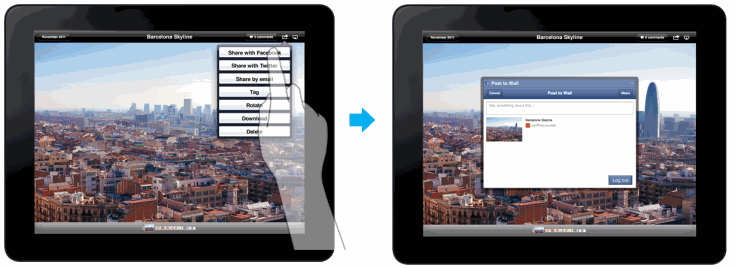 iPad版本:用戶需要點(diǎn)擊導(dǎo)航欄右側(cè)的相關(guān)動作按鈕,并從展開的列表中選擇“分享到Facebook”。如果要使應(yīng)用支持更多的分享服務(wù),開發(fā)人員必須在該應(yīng)用當(dāng)中逐一增添。