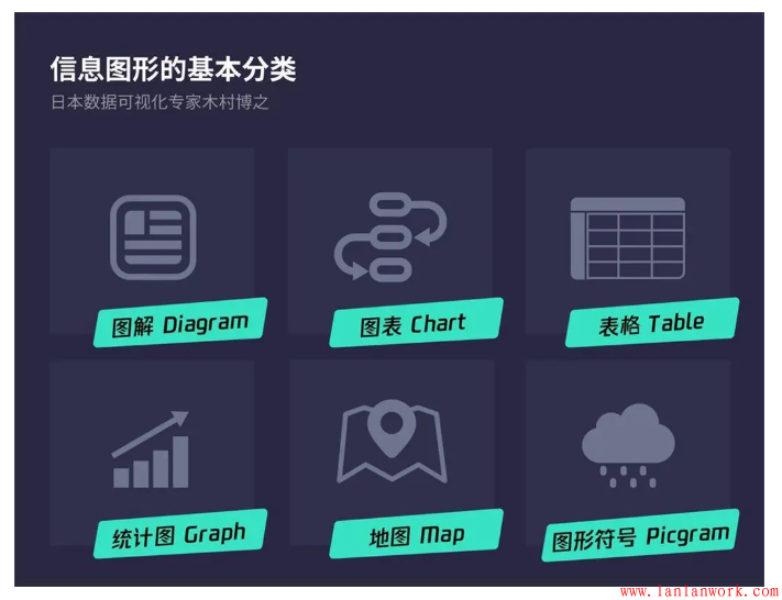 根據(jù)木村博之的定義,從視覺(jué)表現(xiàn)形式的角度,將「信息圖表」的呈現(xiàn)方式分為六大類(lèi):圖解(Diagram)、圖表(Chart)、表格(Table)、統(tǒng)計(jì)圖(Graph)、地圖(Map)、圖形符號(hào)(Pictogram)。