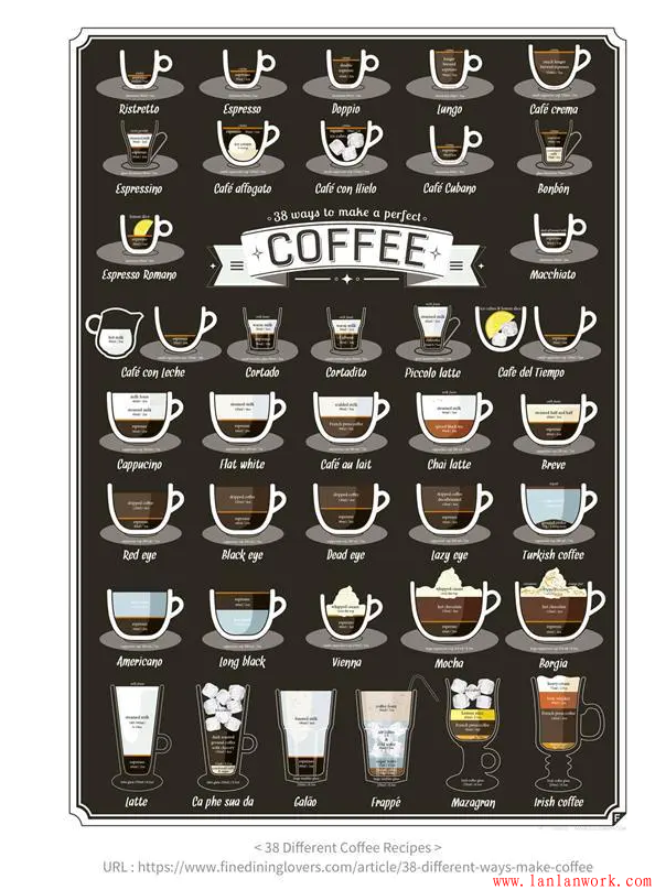 文字有時(shí)候是一種匱乏的信息傳遞方式,而可視化的方式,則是人類(lèi)最本源的一種信息傳遞方式,圖解就是將很多無(wú)法準(zhǔn)確或用語(yǔ)言傳達(dá)的內(nèi)容,以生動(dòng)形象的圖形解釋出來(lái)。下圖是一張經(jīng)典的對(duì)于咖啡種類(lèi)圖解,38種咖啡配方,不必要用多余的文字解釋,直接用圖解表示,簡(jiǎn)單明了,清晰易懂。
