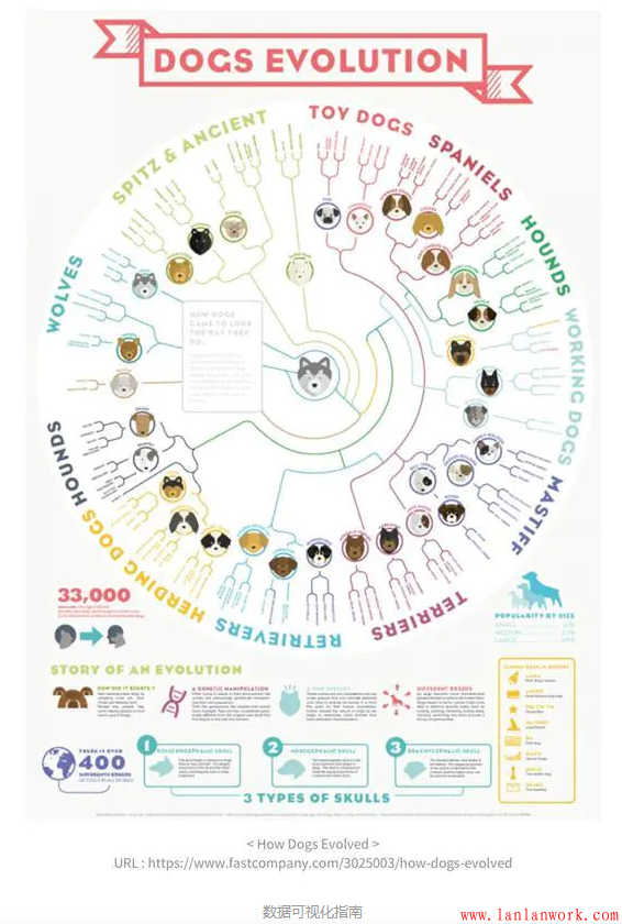 下圖是一張寵物狗的進(jìn)化圖,用巧妙的方式清晰地向我們傳遞了,狼是如何被人類(lèi)馴化成不同種類(lèi)的寵物狗的。
