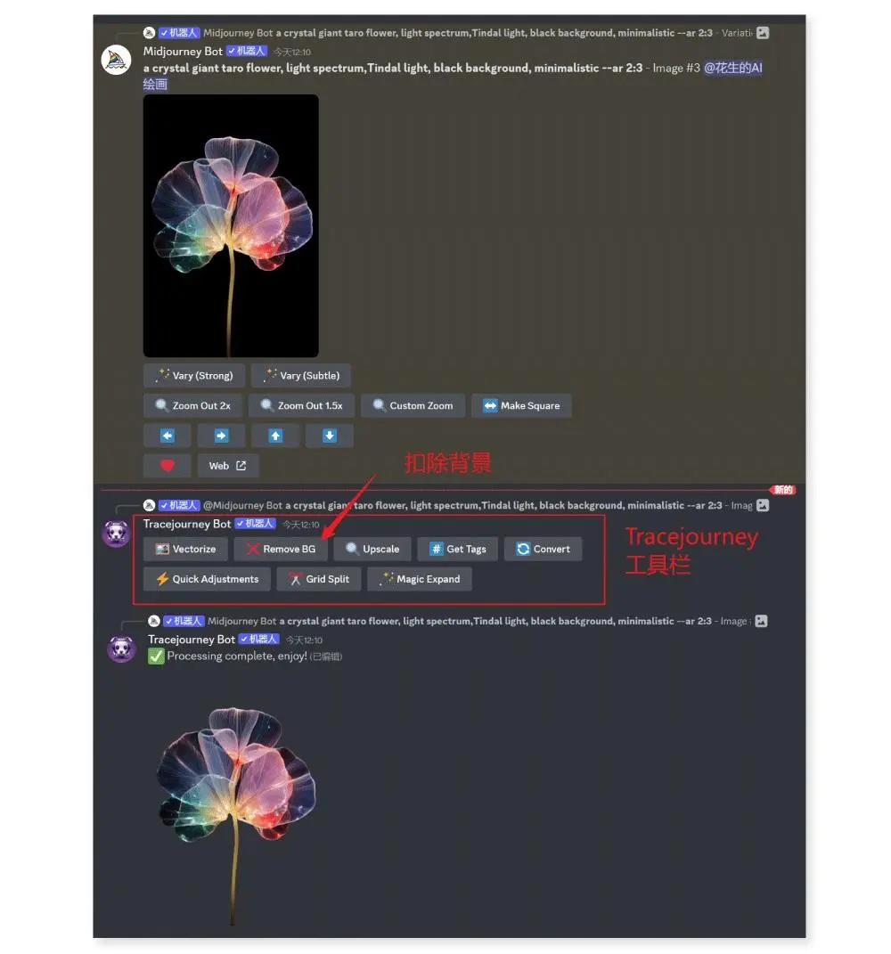 Tracejourney 是一款基于 Discord 的圖像處理工具,功能包括摳圖、圖像轉(zhuǎn) SVG、放大、提取描述詞、格式轉(zhuǎn)換以及亮度和對比度調(diào)節(jié),將圖片直接發(fā)送 Tracejourney bot,在彈出的工具欄內(nèi)點擊對應的按鈕就可以了。