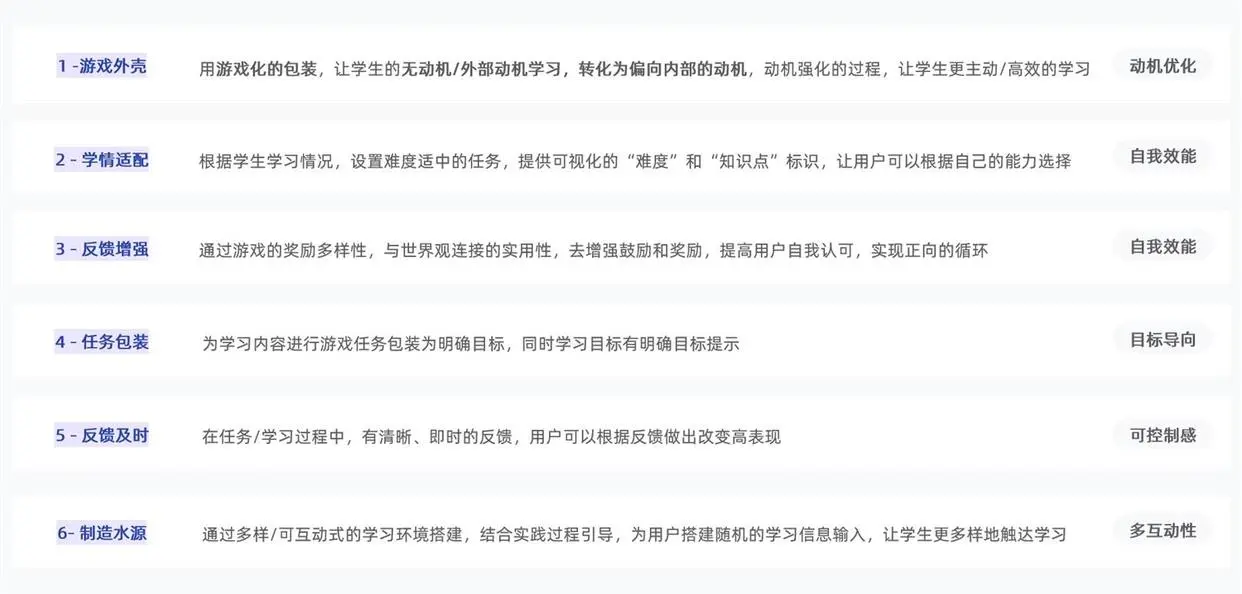 回顧上述內(nèi)容,從教育軟件層面,游戲化設計的切入點可以歸納為如下內(nèi)容。