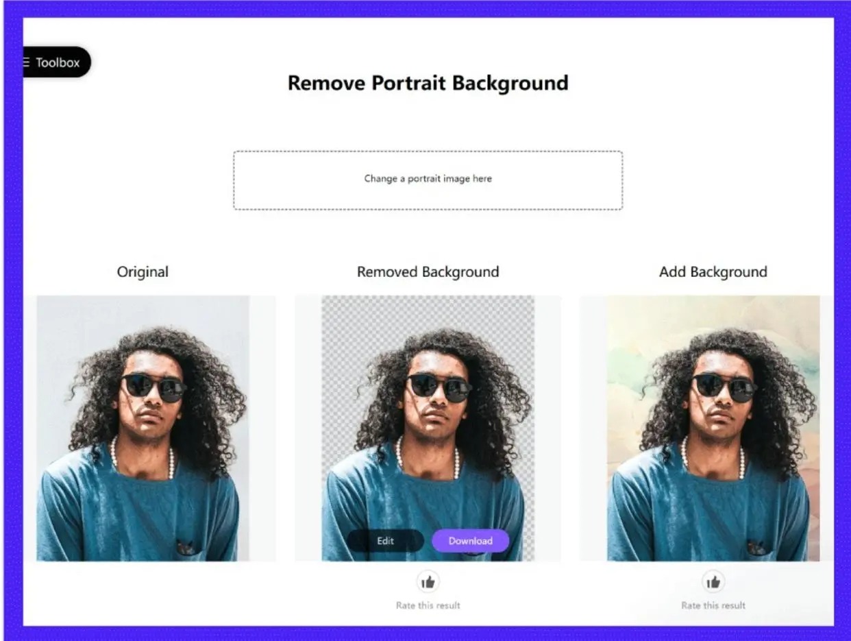 Toolkit 是一個多功能的圖片處理網(wǎng)站,其中就包括一鍵人像摳圖的功能。同樣是免費使用,無需登錄注冊。進入網(wǎng)頁后,上傳本地圖像網(wǎng)頁就會開始自動處理,支持為摳圖后的人像添加自定義背景。