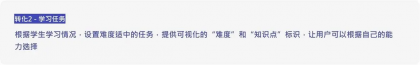 這點轉(zhuǎn)化到教育產(chǎn)品側(cè),為學生提供教學內(nèi)容的學習目標就尤為重要,有方向的學習更有效率。