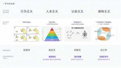 學習本質(zhì)的理論基礎經(jīng)過了 4 個時期的發(fā)展,從行為主義、人本主義、認知主義再到建構(gòu)主義,對于教育者/方的要求越來越高。