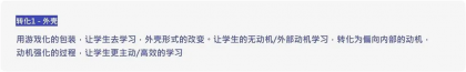 從這個理論來看,我們的第一個轉(zhuǎn)化是“外殼”。用游戲化的包裝,讓學生去學習,外殼形式的改變。讓學生的無動機/外部動機學習,轉(zhuǎn)化為偏向內(nèi)部的動機,動機強化的過程,讓學生更主動/高效的學習。