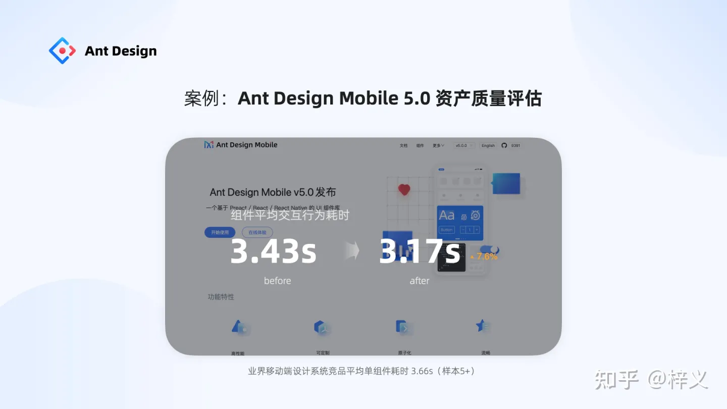 在螞蟻內(nèi)部,我們還將原規(guī)范應(yīng)用到其它設(shè)計(jì)系統(tǒng)的建設(shè)當(dāng)中。比如,Ant Design Mobile 5.0 今年引來(lái)大版本的更新,從 200+ 的冗余組件收斂成了 68 個(gè)通用組件,同時(shí)通過(guò)評(píng)估發(fā)現(xiàn)其組件質(zhì)量也提升了不少,系統(tǒng)中單組件平均交互行為耗時(shí)從 3.42 降到了 3.17,高于業(yè)界平均。