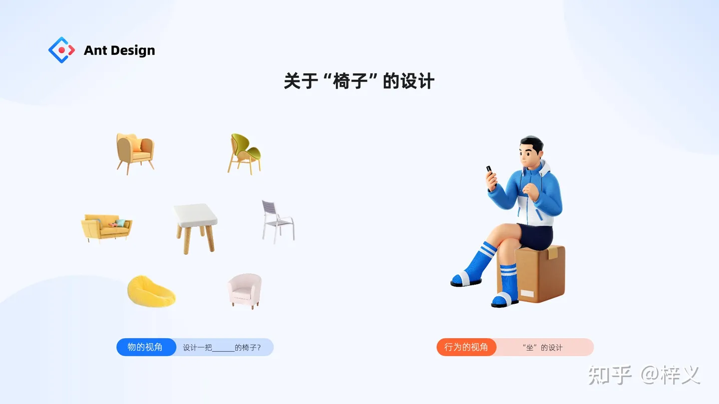 老師接著說(shuō),所謂椅子的設(shè)計(jì),不是要我們?nèi)ニ伎家O(shè)計(jì)“什么顏色的椅子”、“什么材質(zhì)的椅子” 抑或 “什么形狀的椅子”。他希望我們回歸用戶(hù)去思考,設(shè)計(jì)椅子的初衷究竟是為了什么?是為了滿(mǎn)足用戶(hù)“坐”這個(gè)行為目的。