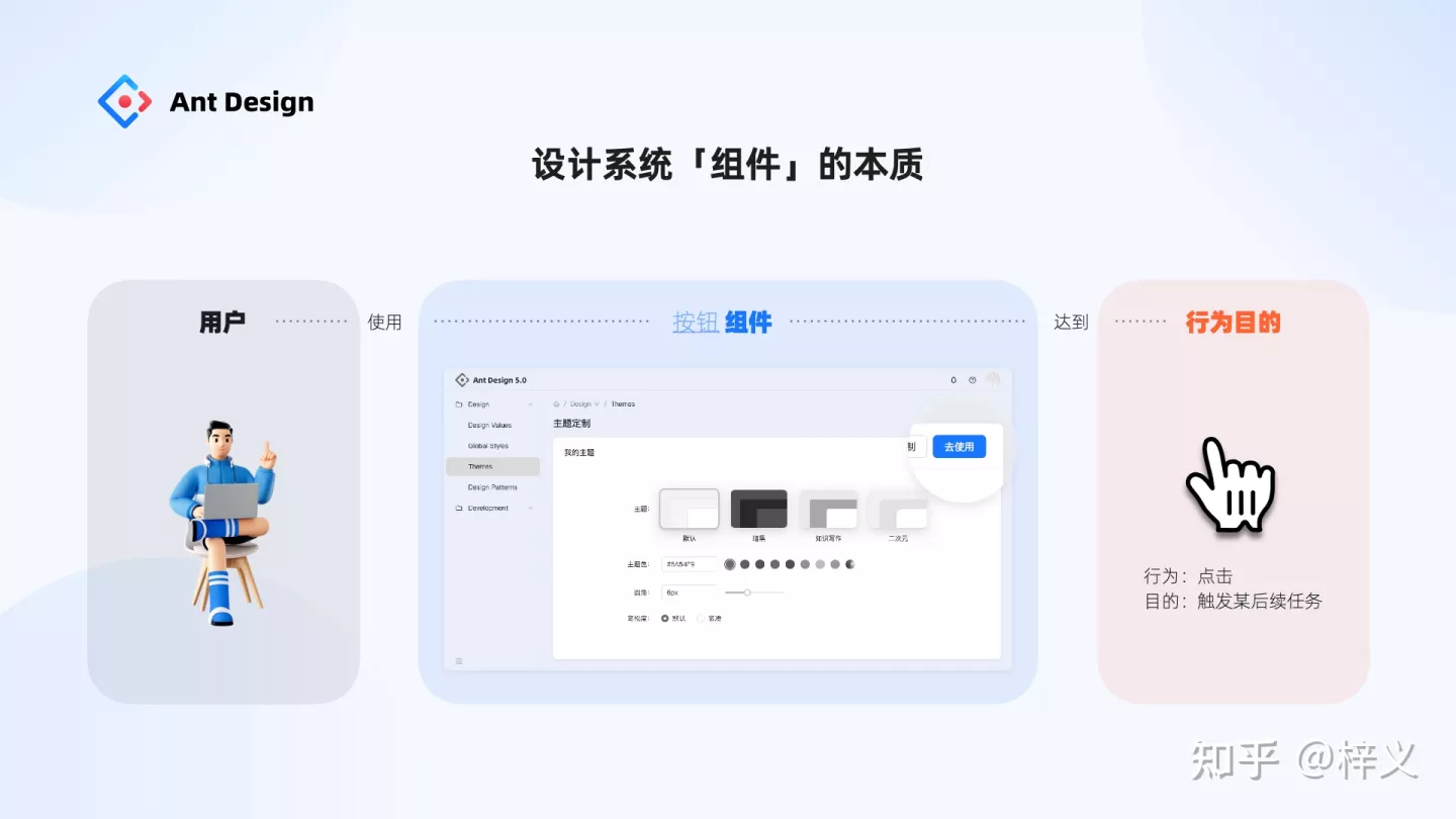 其實(shí),為設(shè)計(jì)系統(tǒng)設(shè)計(jì)一個(gè)組件,一樣如此。用戶(hù)通過(guò)界面使用我們的組件,并非為了用而用,而是為了達(dá)到他的某種行為目的。如果我們回歸到這樣一個(gè)簡(jiǎn)單的本質(zhì),那么對(duì)于組件的定義可能就十分清晰了。