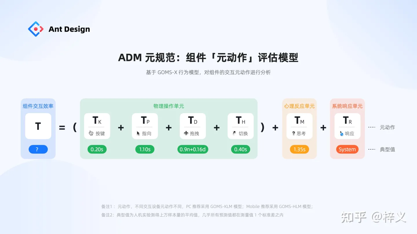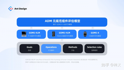 ADM 元規(guī)范的組件評(píng)估模式正式基于 GOMS 人機(jī)交互模型演變而來(lái)。GOMS 是 1983 年 Card 等人在《The Psychology of Huamn Computer Interaction》首次提出的一種交互建模方法,它的核心理念是將用戶(hù)與界面交互行為拆解為行為元?jiǎng)幼?,無(wú)需真實(shí)用戶(hù)介入就能預(yù)測(cè)交互行為的序列,評(píng)估交互的質(zhì)量。